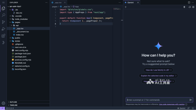- AI辅助开发:Project IDX集成了AI助手Gemini,能够自动生成代码片段,提供实时的编码建议,帮助开发者快速解决编码中的问题,同时也能够提供内联的编码建议,帮助开发者理解复杂的代码结构。