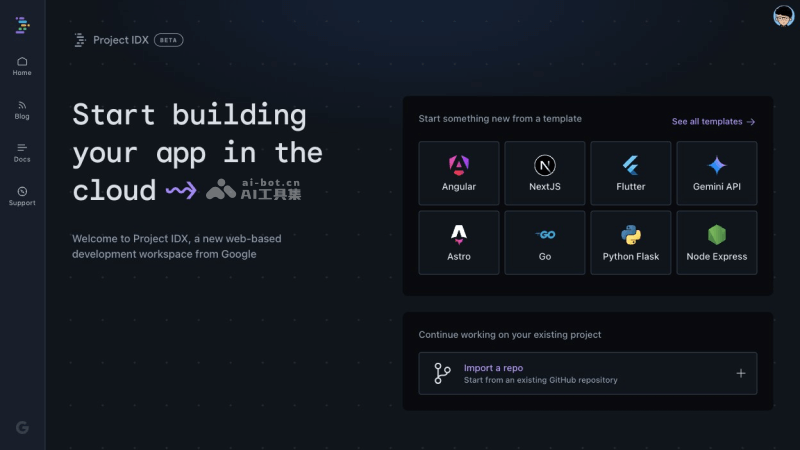 - 模板和环境自定义:Project IDX提供了多种预设的应用模板,开发者可以根据自己的需求选择合适的模板快速开始项目。同时,还支持从GitHub导入现有的应用,使得开发者可以无缝地迁移和继续开发现有项目。