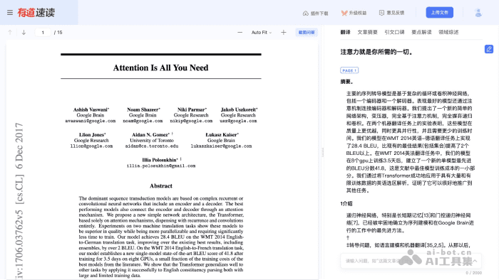 - 有道速读会在左侧展示文档内容,右侧展示文章翻译、摘要、引文、要点和综述等