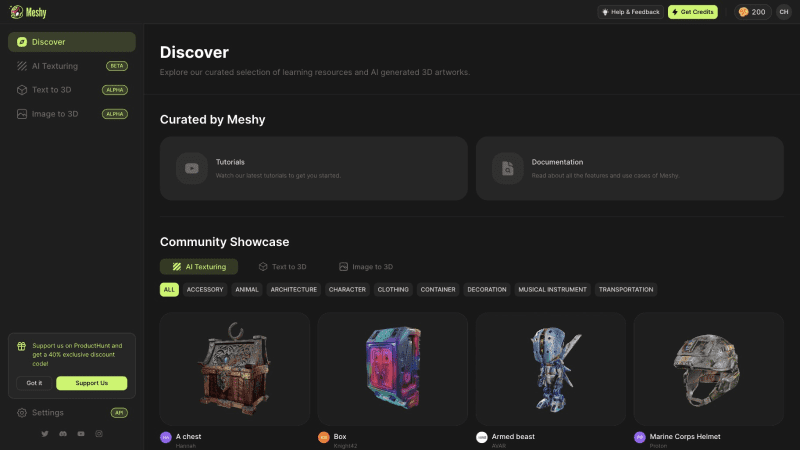 Meshy 是一个 3D 生成 AI 工具箱,可轻松从文本或图像创建 3D 资源,适用于 3D 艺术家、爱好者、XR 开发者、游戏制作者和设计师加速 3D 设计的工作流程。使用 Meshy,用户只需输入一个简单的提示,便可以在几分钟内创建高质量的纹理和 3D 模型。值得一提的是,Meshy 公司的联合创始人兼CEO为计算机图形学知名学者胡渊鸣,太极图形和编程语言的创始人。