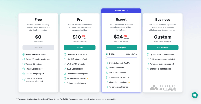 - Expert专家版:30美元每月(288美元每年),每月可获得300个AI积分、创建无限个项目、100GB上传空间、无限制矢量格式导出、使用所有的高级模板、商业许可