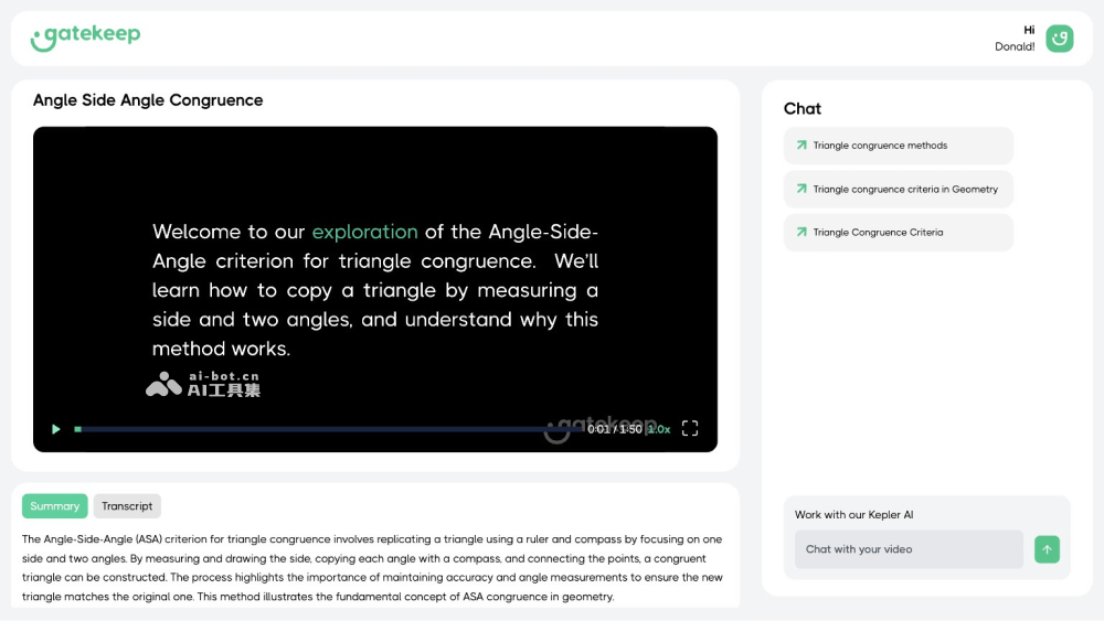 - 专注于数学学习:Gatekeep特别强调其在数学教育中的应用,能够将复杂的数学问题和概念通过视频以简单直观的方式呈现给学习者。