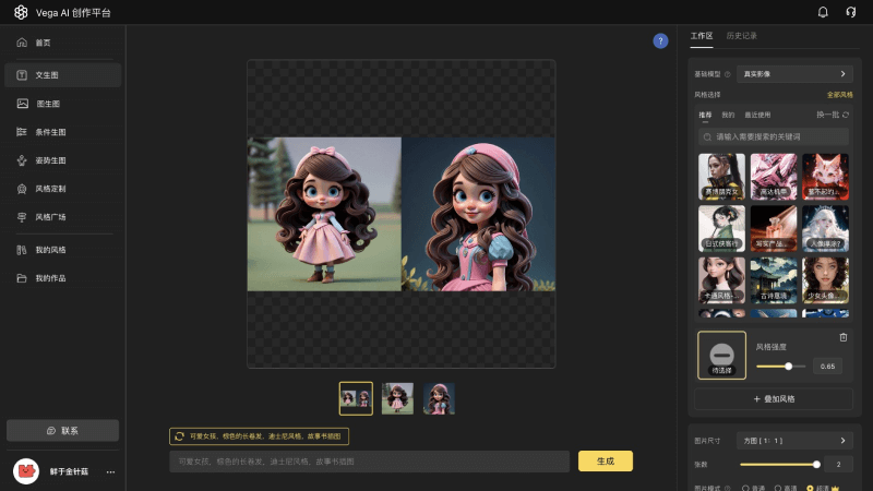 - 文生图:输入文本提示描述,选择风格,即可快速生成高质量图像