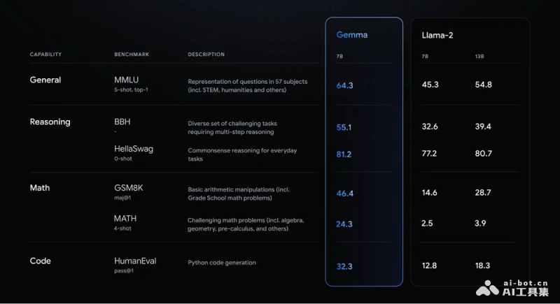- 性能评估:Gemma在多个领域进行了广泛的性能评估,包括问答、常识推理、数学和科学问题解答以及编码任务。Gemma模型与同样规模或更大规模的开放模型进行了性能对比,在MMLU、MBPP等18个基准测试中,有11个测试结果超越了Llama-13B或Mistral-7B等模型。